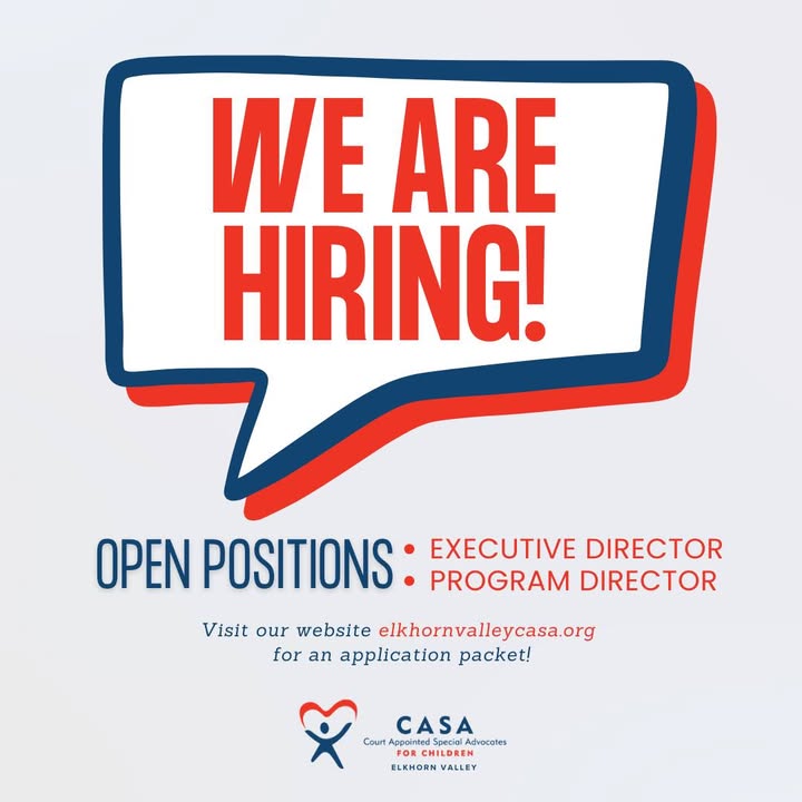 After a few years serving Holt County, our program is expanding to include Madison County. We are in the process of rebranding to our new name and logo - CASA of Elkhorn Valley. We are hiring a Program Director and an Executive Director to manage the offices in O'Neill and Norfolk.