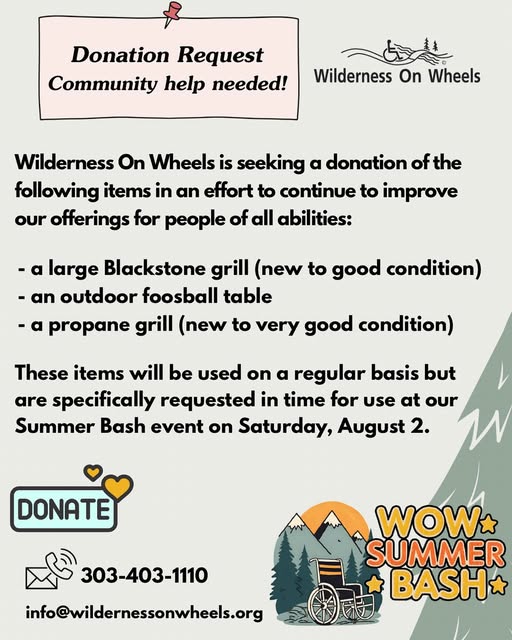 Wilderness on Wheels Providing Access to Nature for All for Over 30 Years Providing ACCESS TO NATUREfor people of all ages abilities their families friends and caregivers for over 30 years. Our 1mile boardwalk rises to over 9000 ft in elevation and allows everyone young and old individuals and groups to roll and stroll through the beautiful Colorado mountains. Spend a day hiking fishing and grilling and then stay the night in a cabin or campsite. WOW is CLOSED for the 2024 season.