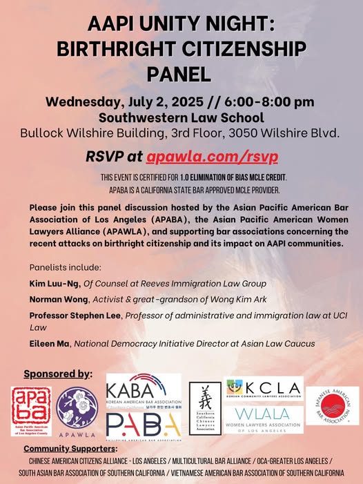 [Co-sponsor] 2025 AAPI Unity Night: Birthright Citizenship Tuesday, July 2, 2025 6pm Panel, 7-8:30pm Reception @ Southwestern Law School Catered by Kreung Kitchen 1. 0 general participatory MCLE credit The Asian Pacific American Bar Association of Los Angeles (APABA), the Asian Pacific American Women Lawyers Alliance (APAWLA), and a number of bar associations present a panel and reception to discuss the recent attacks on birthright citizenship and its impact on AAPI communities. With rising anti-immigrant rhetoric and proposed executive actions challenging longstanding constitutional interpretation, it’s more critical than ever to understand what’s at stake.