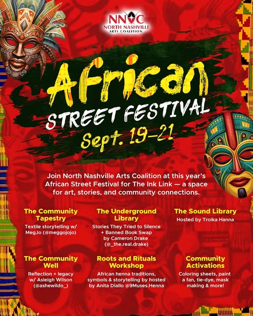 Join us this weekend at the African Street Festival for The Ink Link — a space for art, stories, and community connections hosted by North Nashville Arts Coalition. Here’s what you can experience: 🧵 The Community Tapestry – Textile storytelling w/ MegJo 📚 The Underground Library – Stories They Tried to Silence + Banned Book Swap by Cameron Drake 🎶 The Sound Library – Hosted by Troika Hanna 💧 The Community Well – Reflection + legacy w/ Asleigh Wilson 🌿 Roots & Rituals Workshop – African henna traditions, symbols & storytelling w/ Anita Diallo 🎭 Community Activations – Coloring sheets, paint a fan, tie-dye, mask making & more. 📍 African Street Festival | Sept.