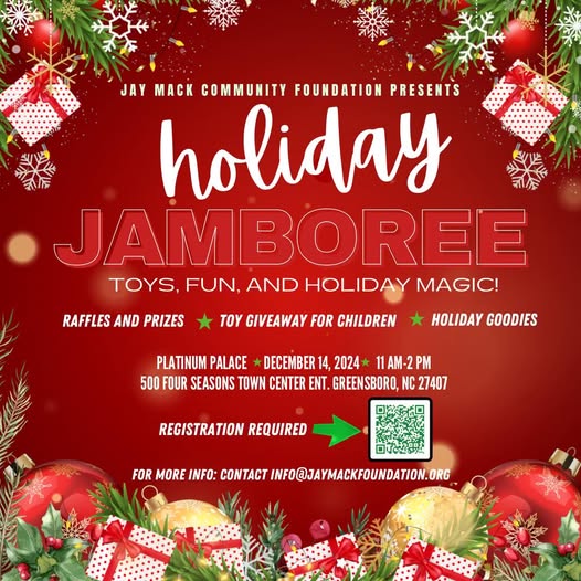 The Jay Mack Community Foundation is excited to announce our inaugural Holiday Jamboree in partnership with the Greensboro chapter of Toys for Tots. Weβre looking for children to join us for a festive day of fun where they can receive free holiday toys in a family-oriented atmosphere full of joy and holiday cheer. We are asking you to refer needy children and families for this spectacular holiday event.