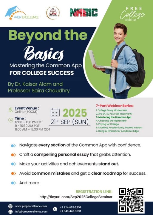 📢 Prep Excellence, MPG, and NABIC present a FREE college webinar: Beyond the Basics: Mastering the Common App for College Success_ 📅 Sunday, September 21st 🕒 12:00 – 1:30 PM EDT / 11:00 AM – 12:30 PM CDT / 9 - 10:30 AM PDT 📍 Venue: Online (Zoom) 🎤 Presenter(s): Dr. Kaisar Alam*, Renowned Educator Professor Saira Chaudhry*, Career Coach *An SAT top-scorer guest speaker 🎟 Registration Link: http://tinyurl. com/Sep2025CollegeSeminar.