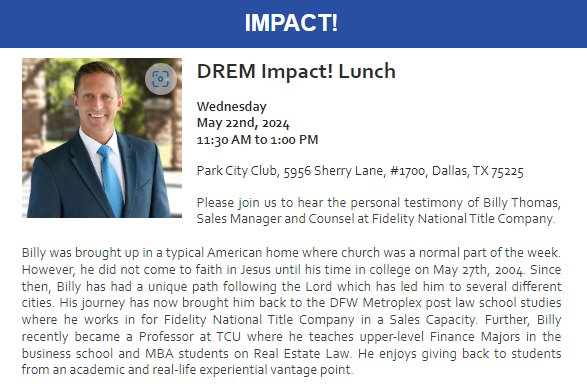 Join Dallas Real Estate Ministries on May 22nd @ 11:30am for our monthly Impact. Lunch. Come hear Billy Thomas, Sales Manager and Counsel at Fidelity National Title, give a personal testimony about his unique path following the Lord and how God continues to use him today.