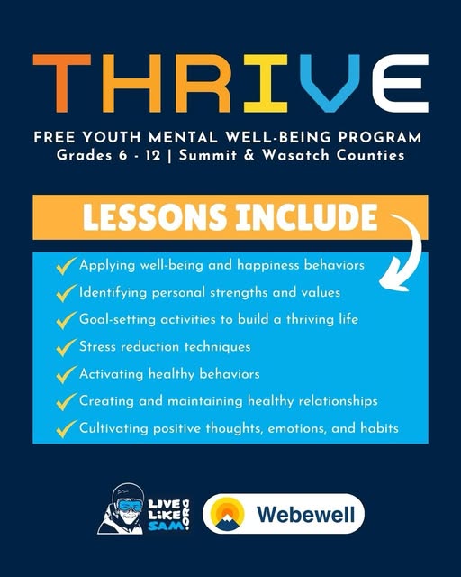 Live Like Sam | Live Like Sam Foundation Super Nav Primary Menu tackling the youth mental health crisis EvidenceBased Programs that Teach Our Kids How to Thrive Join the Movement Stay up to date on upcoming opportunities newsletters scholarships and events. Get timely Live Like Sam news straight to your inbox. Live Like Sam is a fulltime mental health prevention and education nonprofit serving Summit and Wasatch counties. Were finding solutions to the youth mental health crisis through innovative and engaging wellness programming.