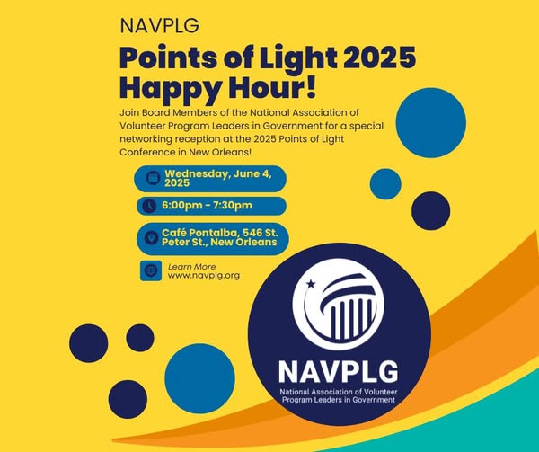 Heading to the Points of Light Conference 2025. Join NAVPLG tonight for a casual Happy Hour — a great chance to connect with fellow leaders working in volunteer engagement at the government level. 🎷 📅 When: Wednesday, June 4 | 6:00 – 7:30 PM 📍 Where: Café Pontalba, 546 St.