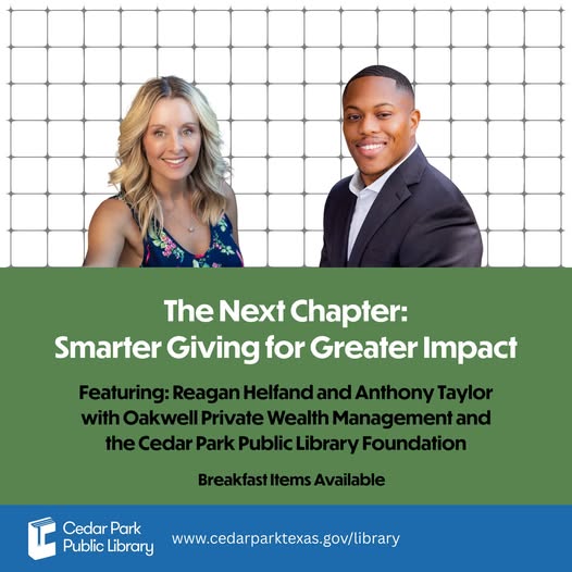 Mark your calendars for an educational morning in the Cedar Park Public Library event space on Friday, October 17th. Reagan and Anthony will share information on Qualified Charitable Distributions, Donor Advised Funds, and other ways to give more tax-efficiently. Added bonus: breakfast.