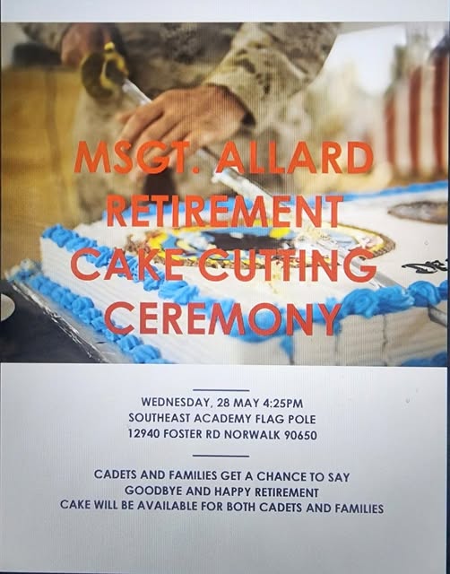 Please join us tomorrow 5/28 after school 1620 at the front flagpole for a Marine Corps cake cutting Ceremony as we say a very heartfelt thank you to our beloved MSgt. Allard for all his years of dedicated service to our Cadets and families. You will be missed, we wish you an amazing and happy retirement, HOORAH.
