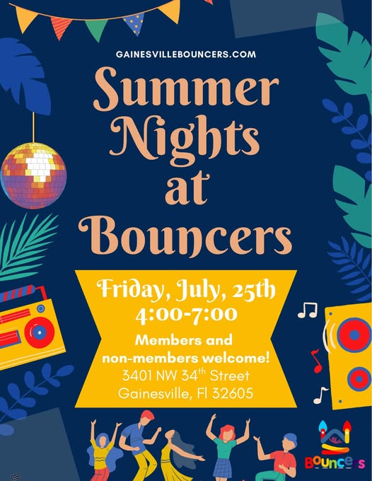 Home | gainesvillebouncers Birthday Parties Memberships Groups Summer Camp Sponsors Charity Work Contact Us More Indoor PLAYGROUND Bouncers Regular Hours Info Tuesday 9amnoon Wednesday 4pm7pm Friday 9amnoon Saturday 10am6pm Sunday 12pm6pm Day Passes are 16 per child online saves2 or Check out ourunlimited monthly membership. It39s the best value in Gainesville and is easy to pause or cancel. Socks and waivers required Best suited for ages 010 years Need to cancel your membership. Click Here Click to See Bouncers Click to buy TicketsIn advance Saves 2 The most incredible CAMP in town lots of FUN and always SAFE.