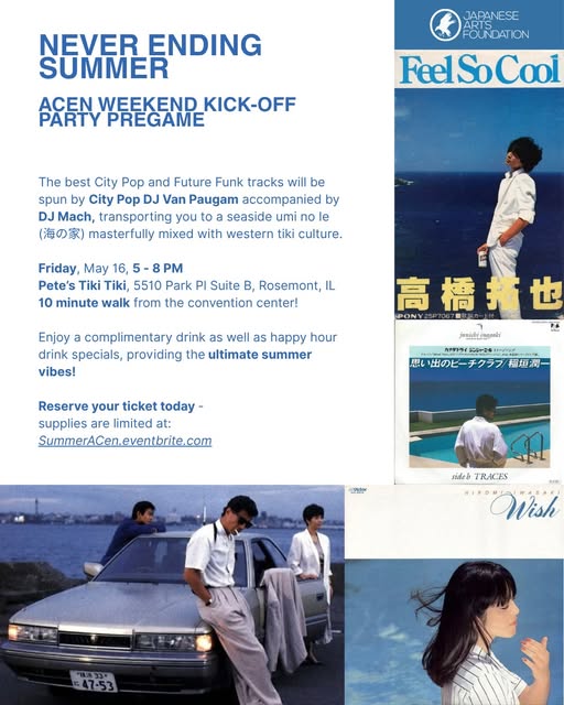 🌊 This Friday, kick-off your ACen weekend with the best way to experience City Pop and Future Funk around, presented by the Japanese Arts Foundation. The best City Pop and Future Funk tracks will be spun by City Pop DJ Van Paugam accompanied by DJ Mach, providing the ultimate summer vibes. 📅Friday, May 16, 5 - 8 PM 📍Pete’s Tiki Tiki, 5510 Park Pl Suite B, Rosemont, IL 🚶♂️10 minute walk from the convention center.