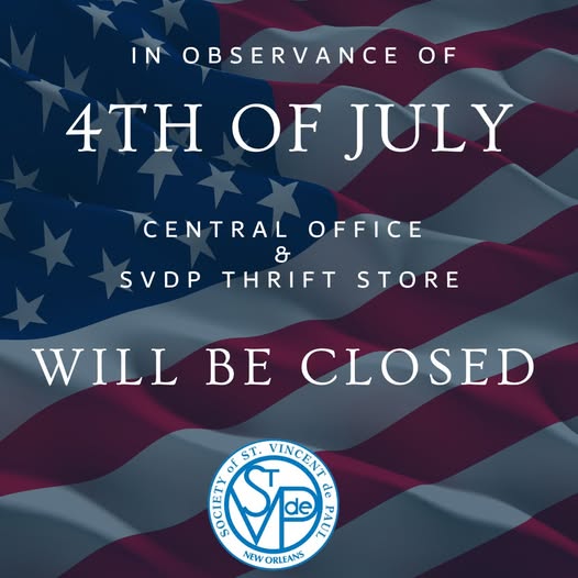 In observance of Independence Day, the Society of St. Vincent de Paul Central Office and Thrift Store will be closed on Thursday, July 4. π Reopening Schedule: Thrift Store: Saturday, July 5 at 10 AM Central Office: Monday, July 8 As we celebrate freedom and community this Fourth of July, we also reflect on the mission of the Society of St.