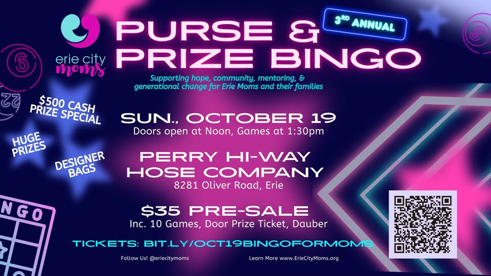 ππ°YOUR CHANCE to WIN BIG while IMPACTING LIVES FOR GOOD. ππΌπ Invest in hope, community, mentoring, & generational change for Erie City Moms and their families. πSunday, October 19 Doors open at Noon, Games at 1:30pm πPerry Hi-Way Hose Company 8281 Oliver Road, Erie π₯$35 Pre-sale includes 10 Games, Door Prize Ticket, Dauber Price increase at the door.