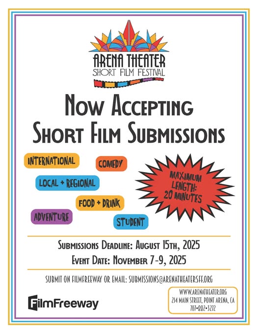 Calling All Filmmakers. Submissions are now open for the 3rd Annual Arena Theater Short Film Festival, happening November 7–9, 2025 in beautiful Point Arena, CA. Whether you're an established director or emerging voice, we want to see your bold, brilliant, and boundary-pushing shorts.