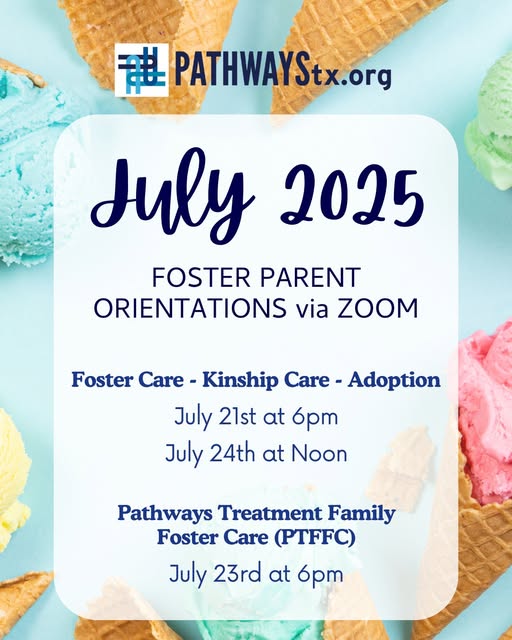 We still have a few Foster Parent Orientation dates this month. During this virtual session, our staff will review the steps to becoming a foster parent in Texas, how Kinship caregivers can become verified, and the options available for those looking to adopt. This no-obligation meeting is the first step to becoming a foster and/or adoptive family in Texas.