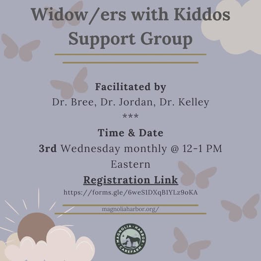 Magnolia Harbor's Widow/ers with Kiddos Support Group will take place on the 3rd Wednesday of October, 10/15/25 for widows and widowers who are raising minor children. . This group is specific for those who have experienced the loss of their partner/spouse/co-parent and have a child(ren) under the age of 18.