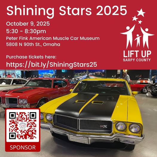 Time is running out to get your tickets to Lift Up Sarpy's Shing Stars, to be held Thursday, October 9 from 5:30-8:00 at the Peter fink American Muscle Car Museum. A night of great food, signature drinks and a chance to celebrate those partners and supporters who have helped us make a difference in the lives of Sarpy families. Get your tickets TODAY.