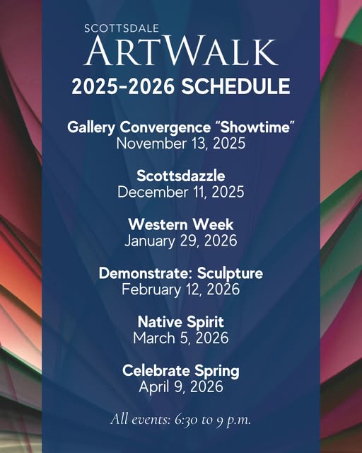 Announcing the 2025-2026 Gold Palette ArtWalk schedule. 🎨🗓 The Scottsdale Gallery Association (SGA)'s Gold Palette ArtWalks are offered throughout the year in addition to the SGA’s weekly Thursday evening ArtWalks and feature extended gallery hours, special activities and experiences for attendees such as complimentary wine tasting and/or small bites, and live music and entertainment that align with each event’s theme. Please note, dates and themes are subject to change.