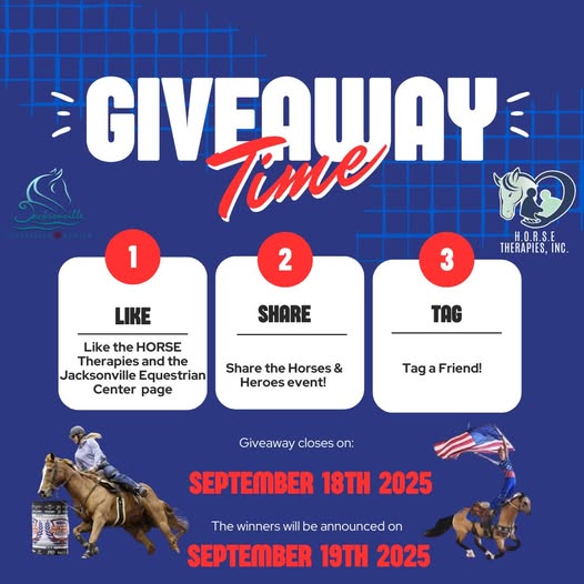 🎟️🐎 HORSES & HEROES RODEO TICKET GIVEAWAY. 🎟️🐎 Want a chance to win FREE tickets to the Horses & Heroes Rodeo at the Jacksonville Equestrian Center. Here’s how to enter: ✅ Share this post ✅ Like HORSE Therapies AND Jacksonville Equestrian Center pages ✅ Tag a friend in the comments below It’s that easy.