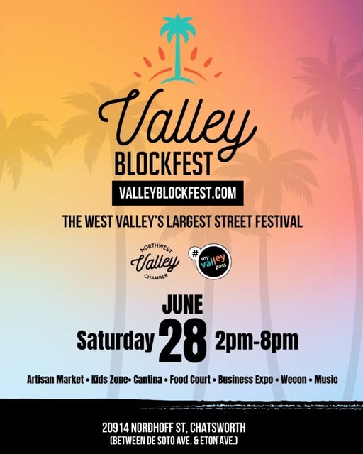HEY EVERYONE. The 4th Annual VALLEY BLOCKFEST (formerly Chatsworth BlockFest) has a NEW DATE and TIME, happening Saturday, June 28th, from 2 PM - 8 PM . The Northwest Valley Chamber and My Valley Pass are proud to present at its new location on Nordhoff St.