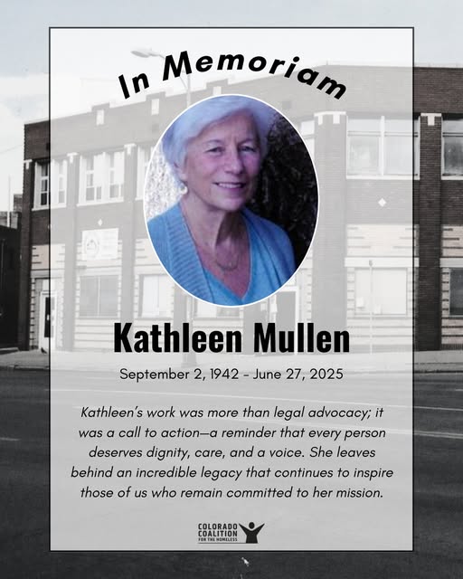 It is with heavy hearts that the Colorado Coalition for the Homeless says goodbye to Kathleen Mullen, a trailblazer for justice and compassion in Denver, and a founder of our organization. Through her leadership alongside others, CCH opened the Stout Street Clinic in 1985, providing comprehensive health services to those most in need—a lifeline for many, and a model for how compassion can be woven into the fabric of systemic change. As a lawyer, Kathleen fought tirelessly for those who were too often overlooked by society, most notably, in the case of Ruth Goebel, whose suffering sparked a movement for mental health reform.