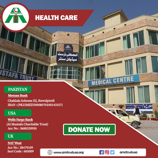 Al Mustafa Trust is a charitable organization that is dedicated to the primary healthcare of poor and needy people free of cost throughout Paki. Trust has set up 21 medical centers in the urban and rural areas of Pakistan since its establishment in 1998.