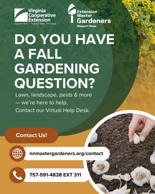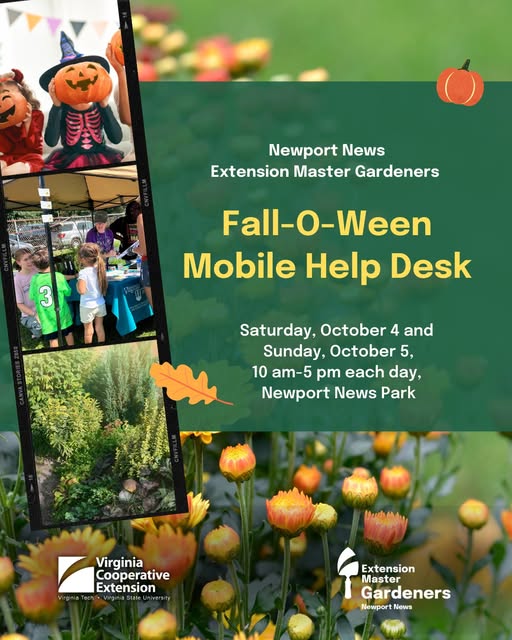 The Newport News Extension Master Gardeners are excited to be part of the FALL-O-WEEN Festival at Newport News Park on October 4 & 5. We’ll have fun children’s activities both days. 🍂 Our Mobile Help Desk will be there to answer all your fall gardening questions—mulching, planting, and why it’s best to “leave the leaves”.