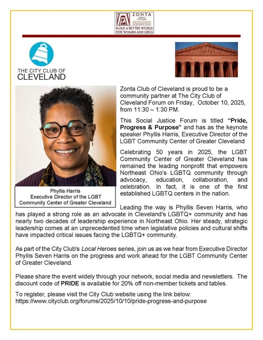 Zonta envisions a world in which women's rights are recognized as human rights and every woman is able to achieve her full potential. In such a world, women have access to all resources and are represented in decision making positions. The Zonta Club of Cleveland (ZCC) is a group of successful professionals who have committed themselves to helping improve the legal, political, economic, educational, health and professional status of women through community and international services. Zonta envisions a world in which women's rights are recognized as human rights and every woman is able to achieve her full potential. In such a world, women have access to all resources and are represented in decision making positions on an equal basis with men. In such a world, no woman lives in fear of violence.