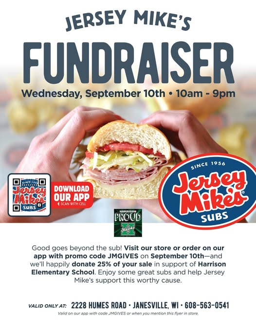 Harrison’s Jersey Mike's Fundraiser is tomorrow (9/10). Stop by anytime between 10 AM and 9 PM to enjoy a great sub and help our school. Order in-store or through their app using promo code JMGIVES, and 25% of your sale will be donated back to Harrison Elementary PTO.
