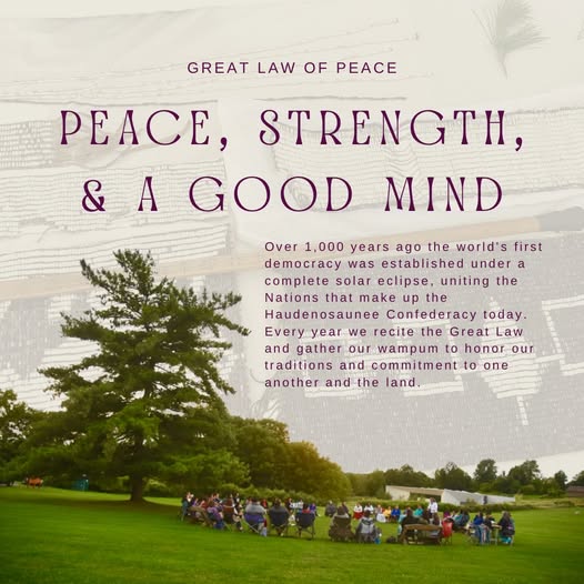 "The gift of the Great Law of Peace is not private property, it is to be shared. And it increases the more it is shared. β -Haiwhagaiβi Jake Edwards, Onondaga Nation, Eel Clan The recital of the Great Law and our gathering of wampum is a tradition that each year fortifies our sovereignty, our aims towards peace, our strength in unity, and our Good Mind.