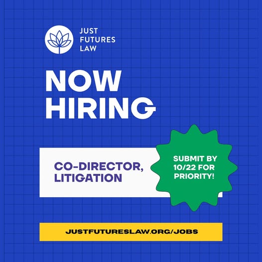 📣 We’re hiring. Just Futures Law seeks a seasoned and dedicated Co-Director of Litigation to help lead strategic legal challenges to repressive immigration policies, surveillance practices, and threats to First Amendment rights. This is an exciting opportunity for an experienced civil rights litigator who is passionate about supporting grassroots movements and directly impacted communities.