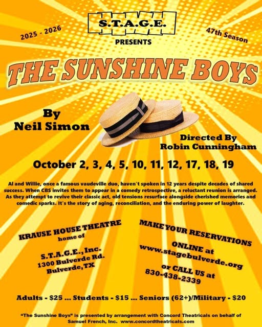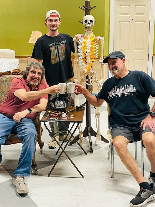 Scott Leibowitz (Willie), Jim Mammarella (Al), Davis Hayes (Ben), and Edgar (Skeleton) are celebrating the end of a great rehearsal for Neil Simon’s “The Sunshine Boys” opening October 2nd at STAGE CO PRODUCED BY DENT DAWG/GLASS DAWG. Call 830 438 2339 or go to stagebulverde. org.