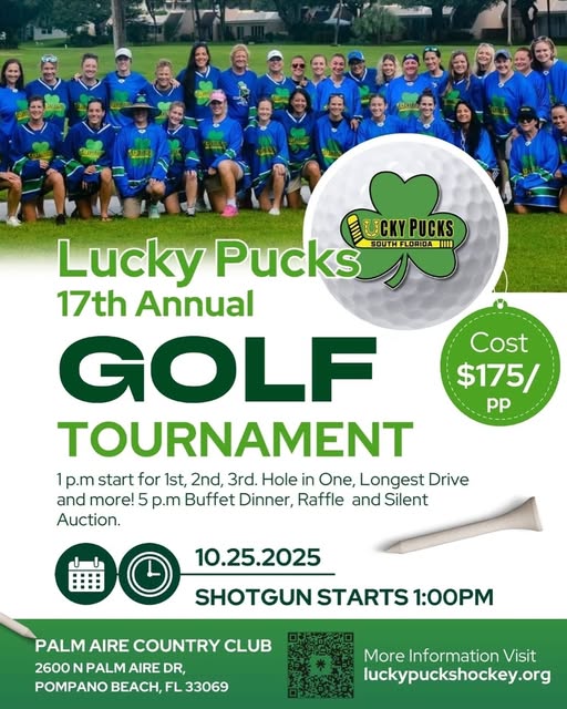 ⛳️✨ It’s tee time, Lucky Pucks style. ✨⛳️ Join us for the 17th Annual Lucky Pucks Golf Tournament on Saturday, October 25, 2025 at Palm Aire Country Club in Pompano Beach. 🏌️♀️🌴 🎯 Prizes for 1st, 2nd, 3rd 🎯 Hole-in-One + Longest Drive contests 🎯 Raffle + Silent Auction 🍴 Buffet Dinner at 5 PM 👉 Cost: $175 per player 👉 Shotgun start at 1 PM This event is always a blast — don’t miss your chance to play, compete, and support women’s hockey in South Florida.