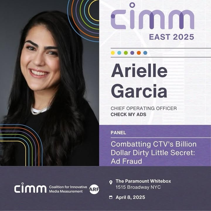 Come say hi to Check My Ads tomorrow at the 2025 CIMM Summit East. Our Chief Operating Officer, Arielle Garcia, will be speaking on the panel, “Combatting CTV’s Billion Dollar Dirty Little Secret: Ad Fraud,” alongside experts from all sides of the marketplace for a critical discussion on the growing issue of fraud in connected TV advertising. This important panel will cover detection strategies, accountability measures, and collaborative solutions that can help protect the integrity of the rapidly expanding CTV ecosystem.