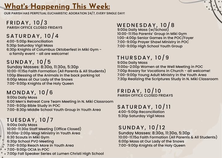 A vibrant Catholic parish, within the Archdiocese of Anchorage-Juneau. We are located on Huffman Road Parish Mission: To gather together to build up the body of Christ to be sent to love and serve God and others. Vision: Forming a community of intentional disciples who are becoming missionary disciples seeking to build up the body of Christ across our community. Our Ministry Culture: We are an active and vibrant parish, deeply committed to following Christ wherever he leads us. As a result, our parishioners are dedicated to growing a culture that supports: - A Sacramental life nurtured by Christ’s incarnate presence, active and alive through the Sacraments of the Church - Personal spiritual growth through intentional discipleship - A Family-Centered approach to spiritual, intellectual, and affective formation - Welcoming and outreach with an ever-present awareness that the Church is