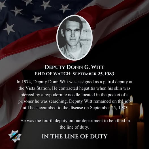 🕊️In 1974, Deputy Donn Witt was assigned to patrol out of the Vista Station. While searching a prisoner, he was pierced by a hypodermic needle hidden in a pocket and contracted hepatitis. Despite his illness, Deputy Witt continued to serve with dedication until September 25, 1983, when he tragically lost his life—becoming the fourth deputy to die in the line of duty.