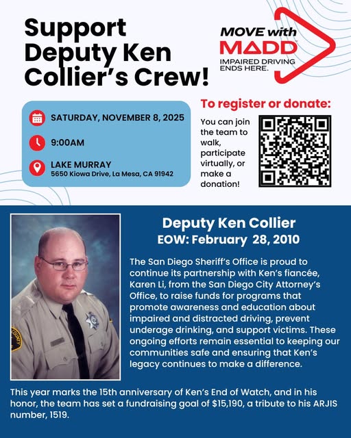 Join us in honoring Deputy Ken Collier’s legacy by supporting Ken Collier’s Crew at the Move with MADD 5K on Saturday, November 8 at Lake Murray. 💙 This year marks the 15th anniversary of Ken’s End of Watch, and the team is walking to continue his mission of keeping our communities safe. You can walk, participate virtually, or donate—just scan the QR code to get involved.