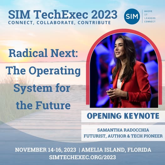 📢 SIM TechExec Opening Keynote Speaker Announcement 📢 We are elated to announce Samantha Radocchia (Sam Rad) as the opening keynote for SIM TechExec 2023. Sam is a futurist, best-selling author, multimedia storyteller, and frontier tech pioneer who combines the mindsets of an anthropologist and technologist. Emergent technologies such as AI, Blockchains/Web 3, VR/AR, Metaverses, and Quantum Computing are ushering in the next radical shift in human, machine, and social evolution.