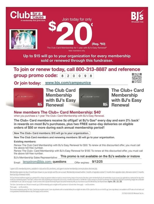 SUPPORT CAMP EUNICE - PURCHASE YOUR BJ's MEMBERSHIP THROUGH US BY SEPTEMBER 12TH BJβs Wholesale coming soon to Warner Robins, GA. Purchase your membership now and save money while supporting Camp Eunice. New Members β Only $20 for the Club Card OR $40 for the Club+ Card.