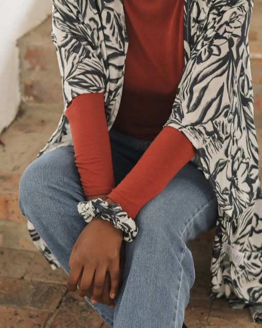 Our kimono in moonbeam is the perfect trans-seasonal item. Layer it over a tank in summer or a turtleneck in fall—this flowy favorite moves with the seasons (and your mood). Plus with every kimono purchase you get a matching scrunchy for free made with the offcuts so no material goes to waste.