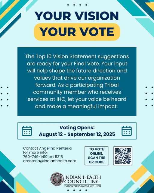 IHC's Native Staff and Board of Directors have worked for over a year to craft a new vision for your health centers. The Top 10 Vision Statement suggestions are ready for your Final Vote. Your input will help shape the future direction and values that drive our organization forward.