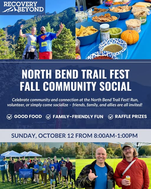 Trail fest is back. 🏃🌲 Lace up, layer up, and join us for a day of community, connection, and adventure at the North Bend Trail Fest — organized by our amazing volunteer and supporter Scott Sowle. Come run, volunteer, or just hang out and connect with other Recovery Beyond members, friends, and family.