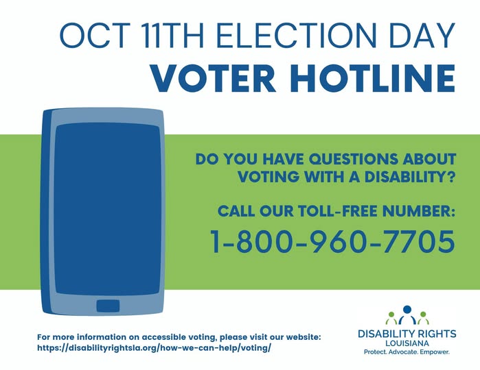 Tomorrow is Election Day. On Saturday, October 11th, DRLA will offer our Voter Hotline to answer your questions about voting and polling place accessibility issues. Our staff attorneys and advocates will be on hand from the time polls open at 7:00am until closing time at 8:00pm.