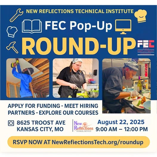 π¨ Ready to start your career, but not sure how to pay for training. Join us for the FEC Round-Up on Friday, August 22nd from 9AM to 12PM at New Reflections Technical Institute β 8625 Troost Ave, KCMO. Whether youβre interested in CDL, Culinary Arts, Construction, Computer Support, or Accounting β this event connects you with funding partners to get your tuition covered.