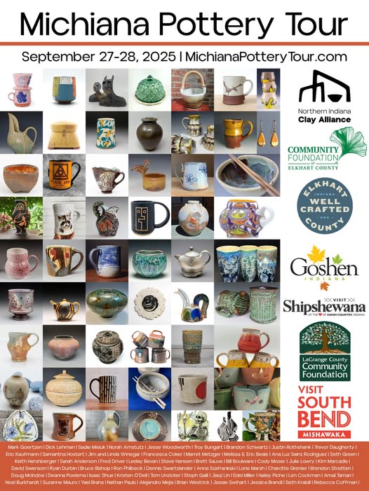 The 14th annual Michiana Pottery Tour takes place on September 27-28, 2025. NICA's longest-running program, this yearly tradition is made possible by the gracious support our sponsors and community partners. Community Foundation of Elkhart County Experience Elkhart County, Indiana The City of Goshen, Indiana Visit Shipshewana LaGrange County Community Foundation Visit South Bend Find more details about this year's event at MichianaPotteryTour.