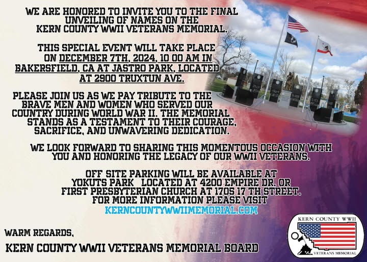 Kern County World War II Veterans Memorial Committee is a group of local volunteers driven by a single goal; to Honor and Memorialize our countries Greatest Generation.