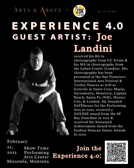 Arts & Above | Missoula Mt Home About Works Community Contact More Upcoming Events EXPERIENCE 4. 0 SaturdayFebruary 22nd 2025 600930pm an immersive performance and installation event curated by Arts Aboves founding directors Kate Jordan Augusto and Bruno Augusto. Featuring work by San Franciscobased Guest Artist Joe Landini and more. Show Tyme Performing Arts Center 2500 Murphy Street Missoula MT 59808 Tickets 25 general admission 10 youth senior anyone else that needs this rate GUEST ARTIST WORKSHOP JOE LANDINI Contemporary Dance Workshop Monday February 17th 10am1200noon Joe will be teaching a somatic warmup improvisation and performance.