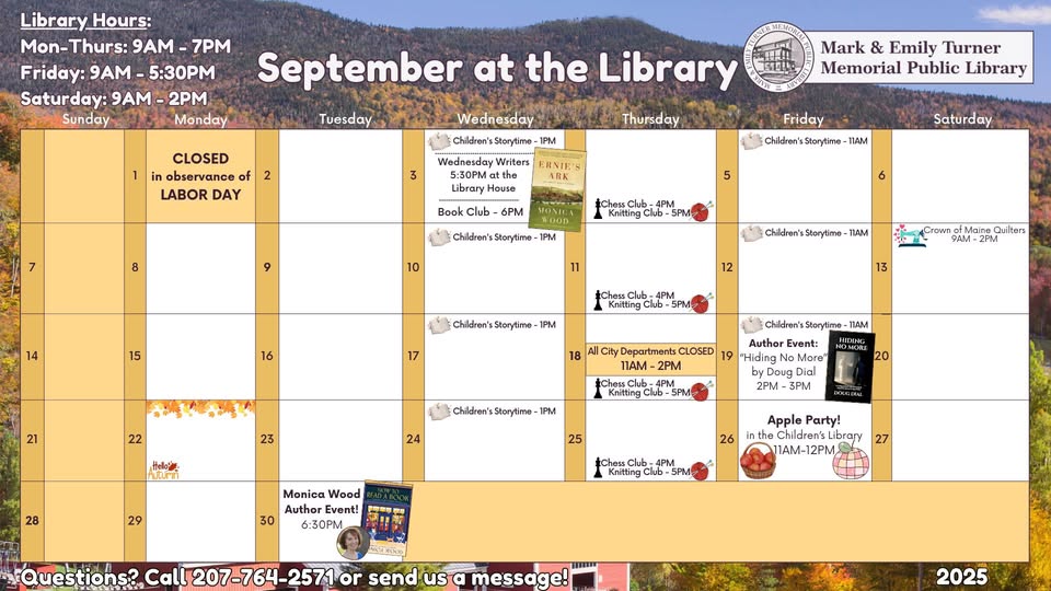 August has left us, September is here. We're rolling into our Fall programming down at the Library, so be sure to keep in touch and see what's in store. We've got TWO author events this month, plus our ever-beloved Apple Party in the Children's Library.