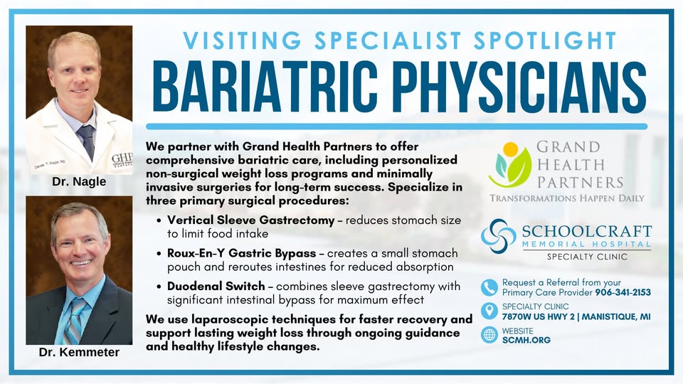 βοΈπ Change Your Lifestyle for the Better. πβοΈ Schoolcraft Memorial Hospital proudly offers Bariatric services in partnership with Grand Health Partnersβhelping individuals take control of their health and transform their lives. β¨ Our expert bariatric surgeons, Dr.