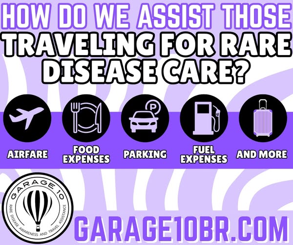 💜🌟 How does Garage 10 assist those traveling for rare disease care. We provide financial support for airfare, fuel, parking, and more expenses one may face through traveling for treatments. 🌟 Share our post to spread the word about Garage 10 so we can assist more families who are affected by rare diseases.
