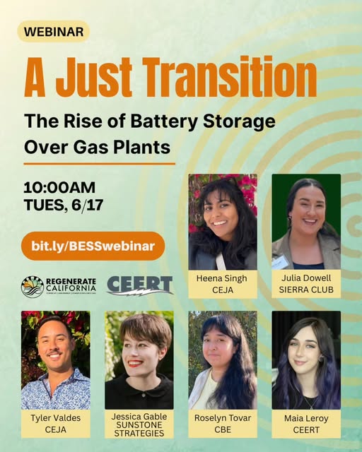 Join us next Tuesday to hear the top findings from our new economic report that explains the importance of batteries in expediting the retirement of CA's remaining gas plants for the sake of ratepayers' healthβand their wallets. Register at bit. ly/BESSwebinar (link in @regenerateca bio) ππ£οΈπ @regenerateca @cejapower @sierraclub @cbe_cal.