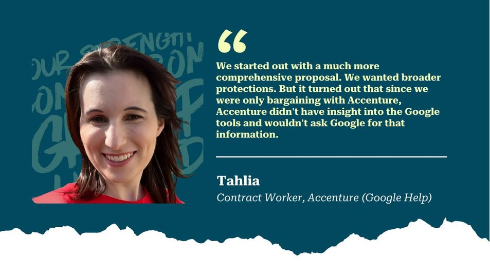 In late 2024, Tahlia and her coworkers became the first Alphabet Workers Union-CWA members on the Google Help team to secure a collective bargaining agreement with Google vendor, Accenture, that includes workplace technology protections. How did they do it. What obstacles did they face.